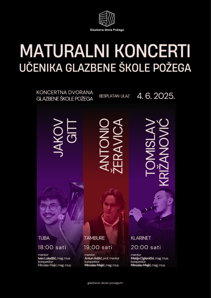 Pozivamo Vas na Maturalni koncert učenika Glazbene škole Požega koji će se održati 4. lipnja 2025. godine u Koncertnoj dvorani s početkom u 18:00 sati.